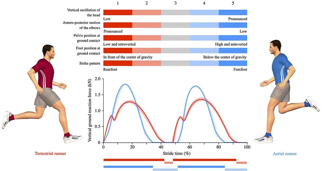 At typical pack running speeds (10-12 km/h), the two strides are equally efficient (Lussiana and all 2017). Aerials expend energy against gravity, then recover some of it in their tendons. Terrestrials expend less energy upward and therefore recover less of it in their bodies. They favor the advancement of the pelvis on the support rather than the elevation of the center of gravity.