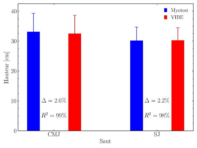 It is observed that VIBE provides nearly identical results to Myotest (2% difference, almost perfect correlation). Same technologies, same performances.